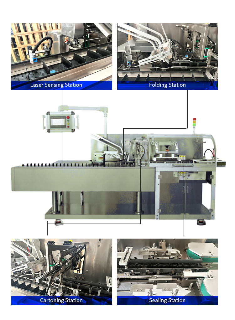 Produk ini dapat diaplikasikan untuk pengemasan obat-obatan, makanan, kosmetik, suku cadang otomotif, elektronik dan kebutuhan sehari-hari, serta barang sejenis. Memiliki fungsi melipat (pencocokan) brosur secara otomatis, membuka kotak karton secara otomatis, mengemas barang, mencetak nomor batch (pencocokan), dan menyegel kotak (juga dapat diaplikasikan untuk perekat panas leleh). Mesin ini dapat digunakan sendiri atau dikombinasikan dengan peralatan lain untuk membentuk jalur produksi lengkap.